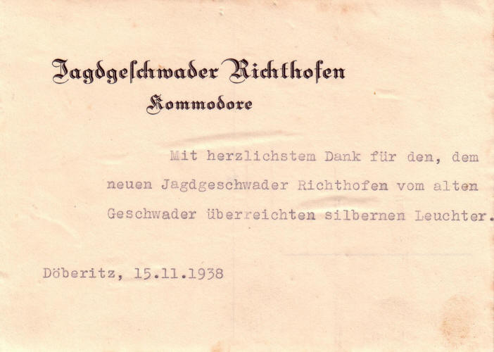 Kerzenständer mit allen Namen der Flugzeug wird dem neuen Jagdgeschwader Richthofen übergeben
