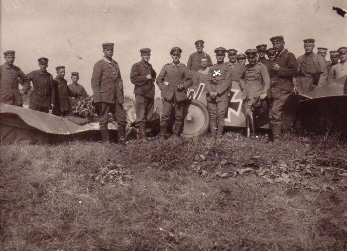 Schutzstaffel 14 am 04. September 1917. Ruckelshausen vor den Trümmern des Flugzeuges von